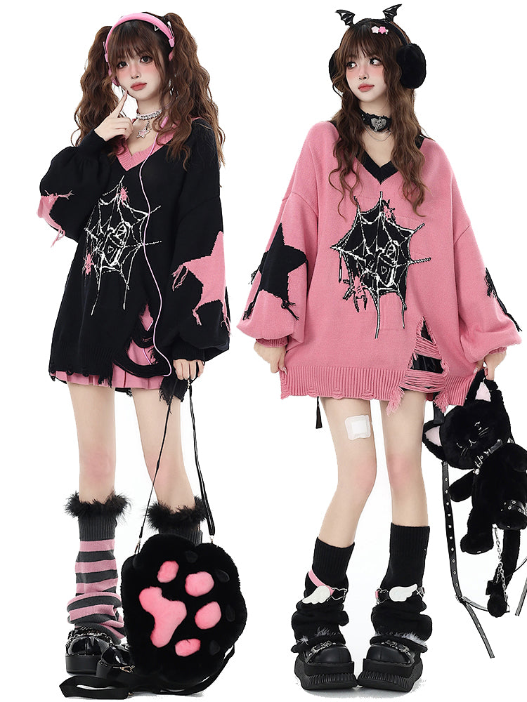 Cool Star Spider Web Pattern Loose V-neck Knit Sweater