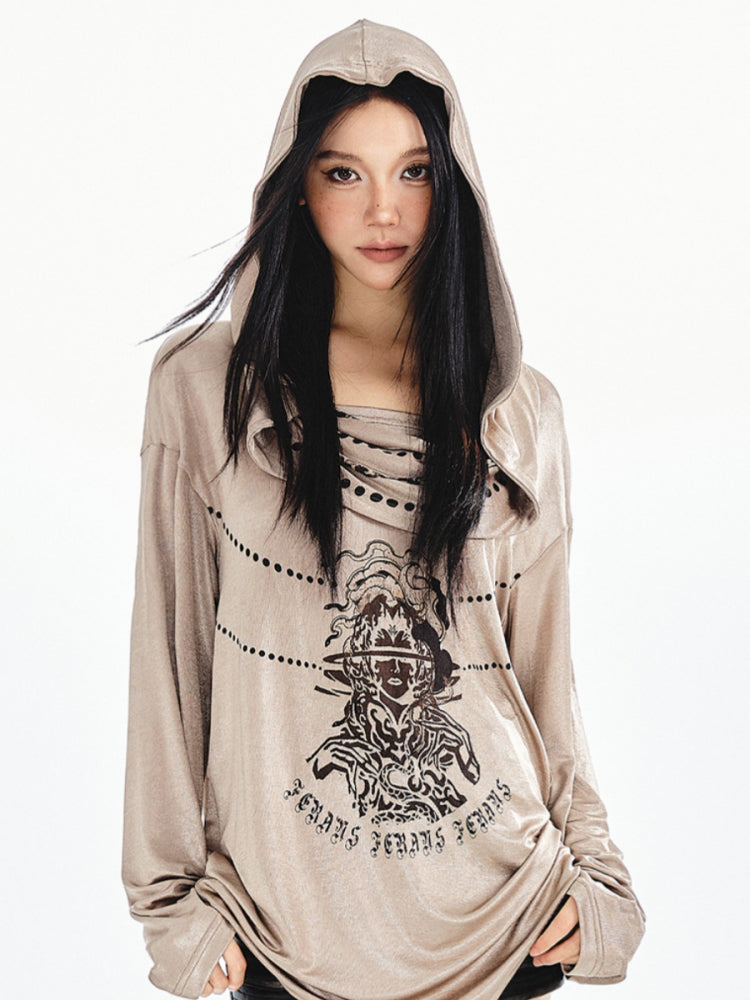 Gray Star Letter Print Subculture Hooded Sweatshirt for Autumn/Winter