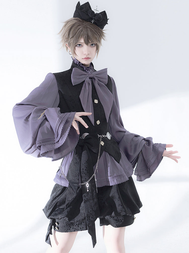 Elegant Purple Blouse with Large Bow and Ruffle Sleeves