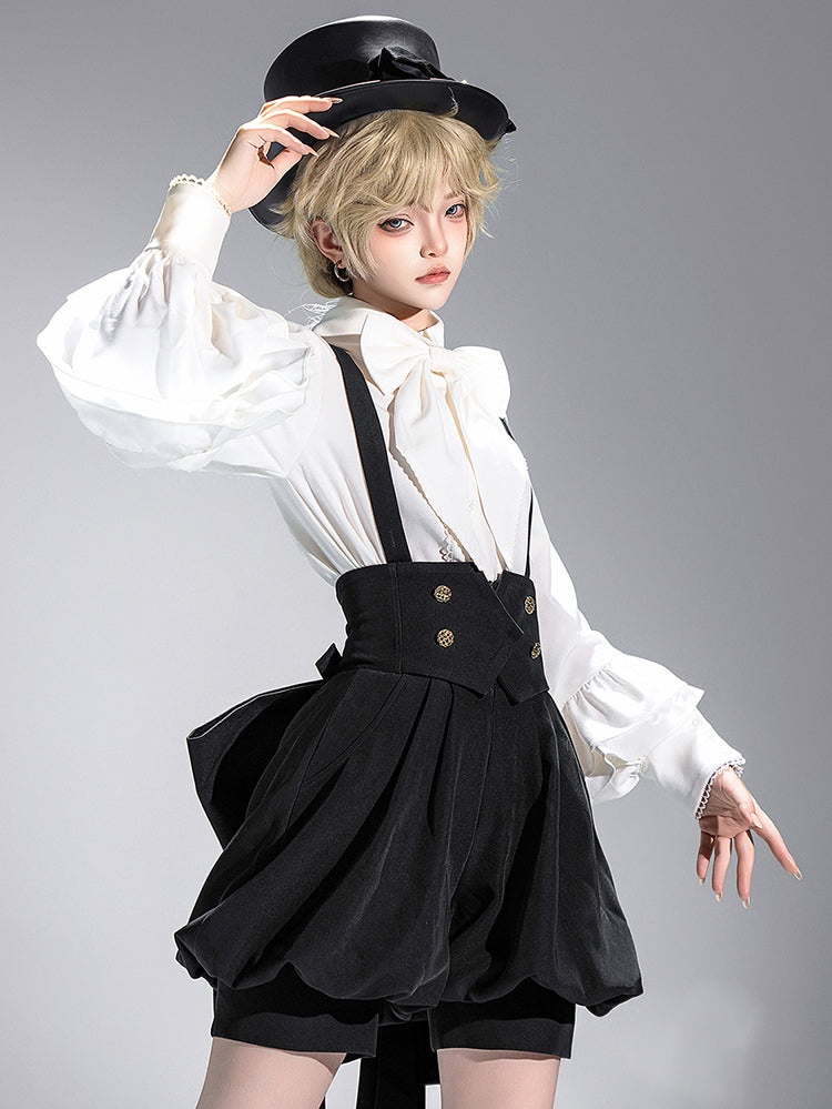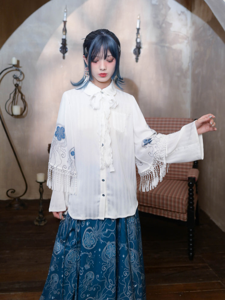 ‘Blue Tears’ printed white shirt with Peter Pan collar and layered sleeves