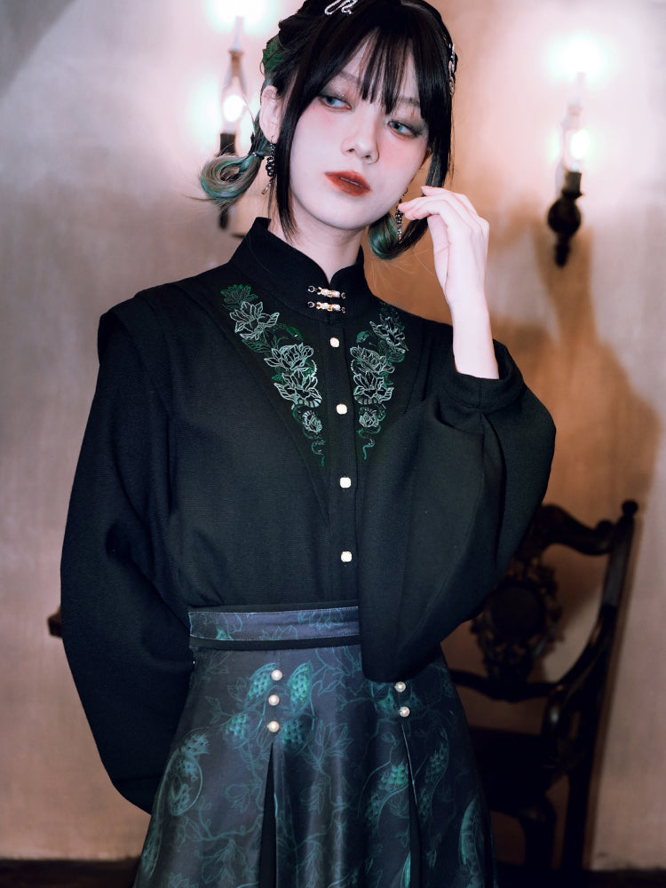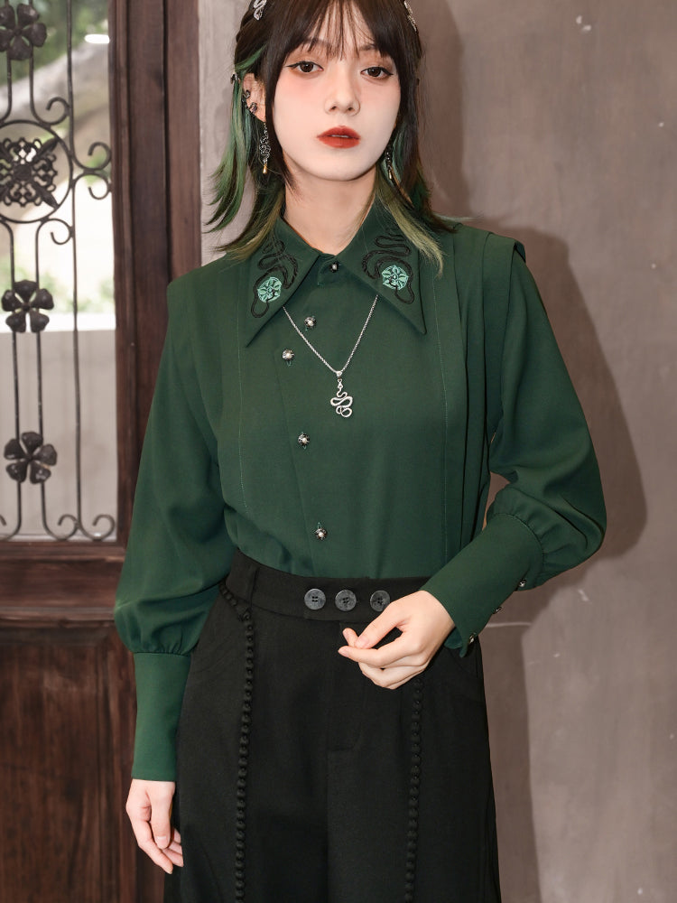 Dark green Chinese-inspired embroidered shirt with asymmetrical pointed collar