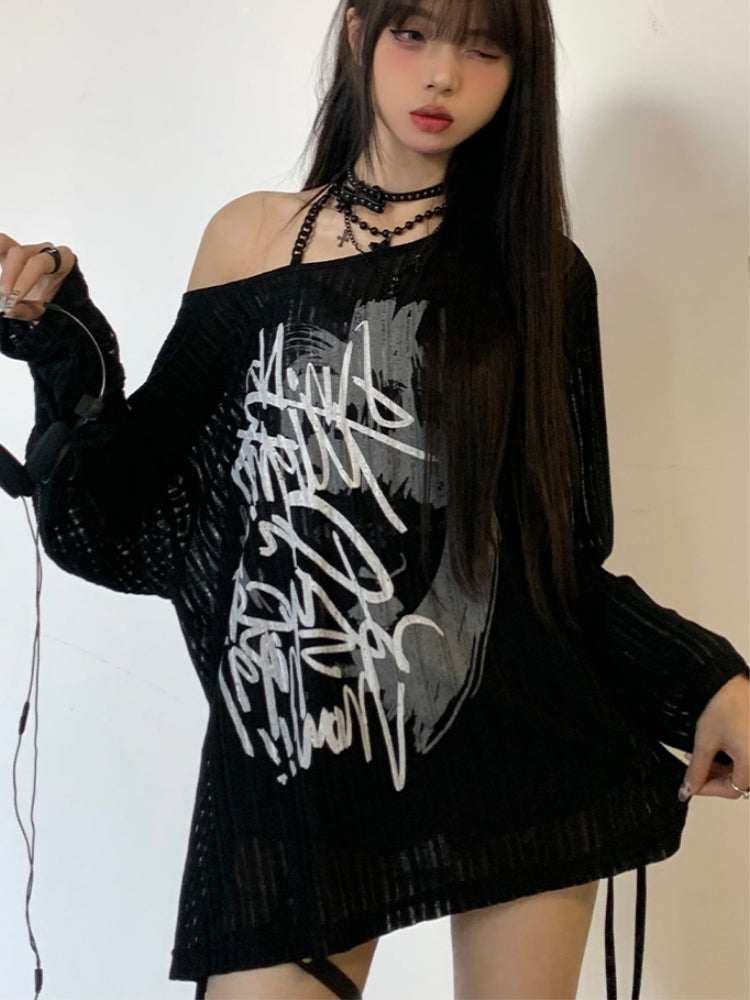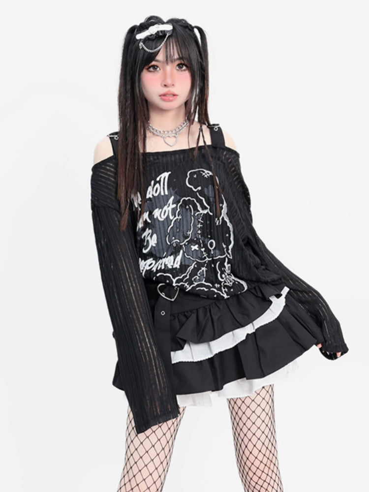 Distressed Bear Gothic Text Print Black Long Sleeve Buckle Strap Top