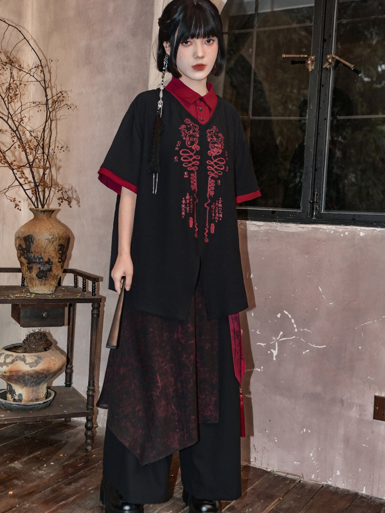 Chinese-style printed faux two-piece shirt
