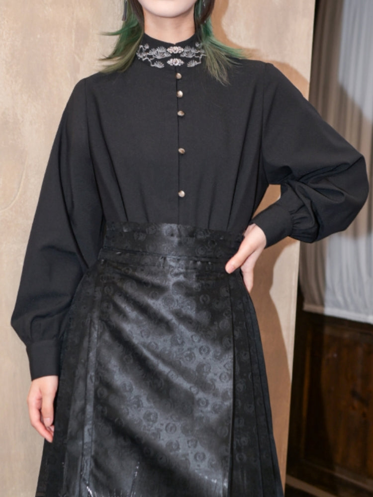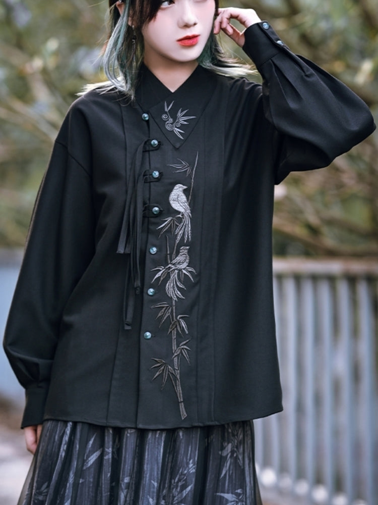 Chinese-Style Embroidered Black Long Sleeve Shirt