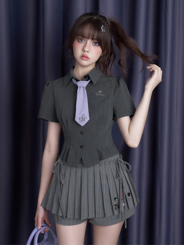 Dark Gray Cinched-Waist Slim-Fit Sweet-Spicy Short-Sleeve Summer Shirt