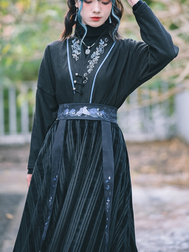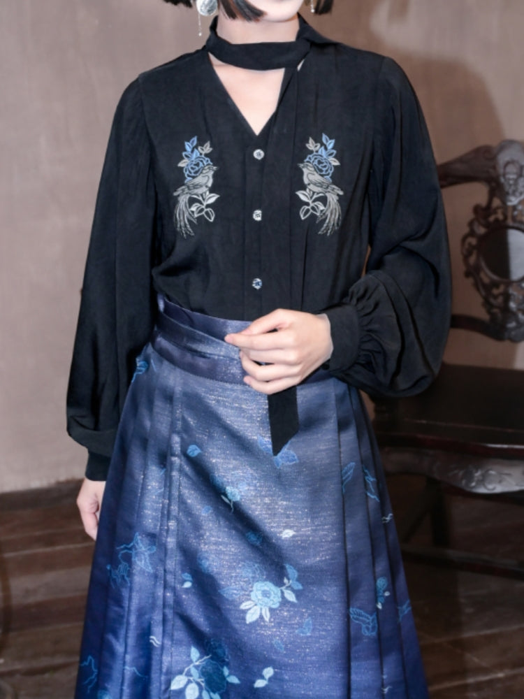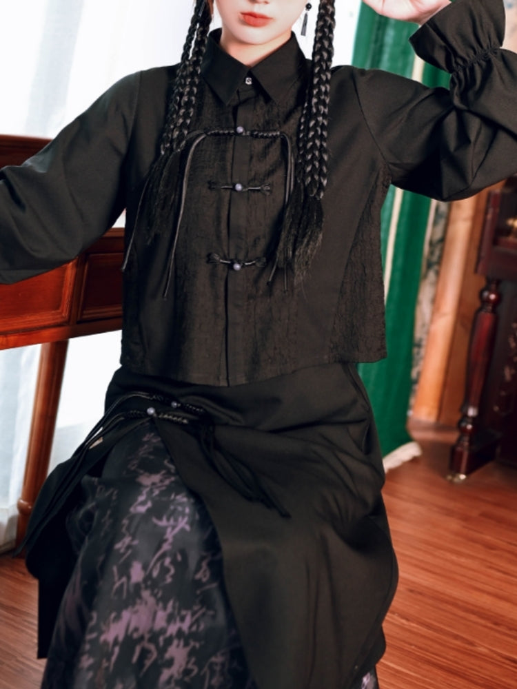 Chinese Style Appliqué Embroidery Asymmetrical Black Shirt