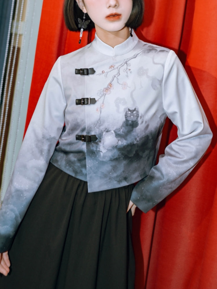 Chinese Style Printed Stand-Collar Top