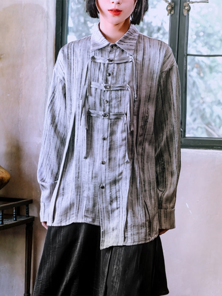 Chinese Style Frog Button Striped Asymmetrical Long-Sleeve Shirt