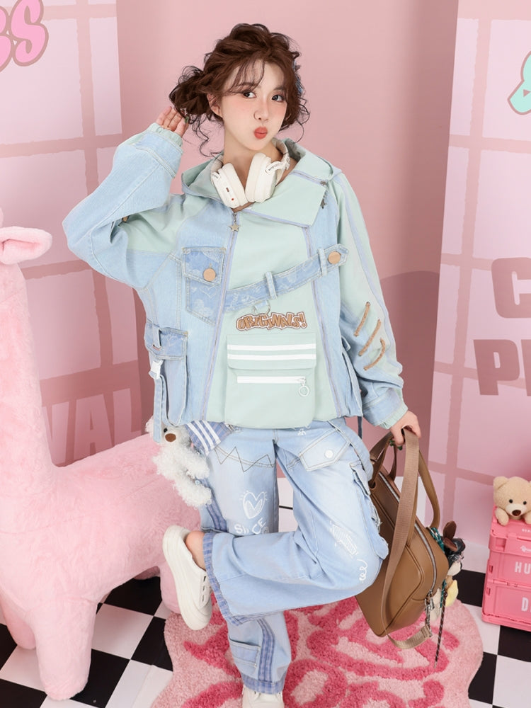 Cargo-Inspired Multi-Pocket Denim Patchwork Jacket