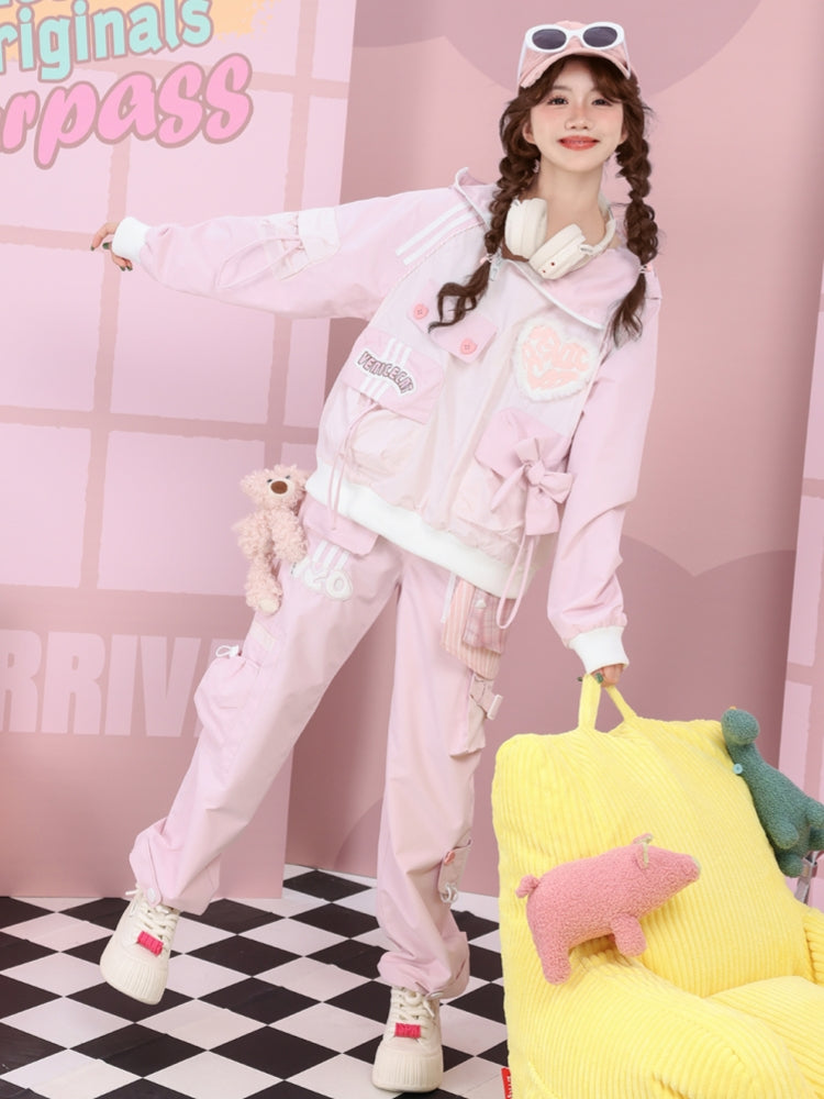 Pink and Black American Baseball Jacket / Casual Pants / Skirt