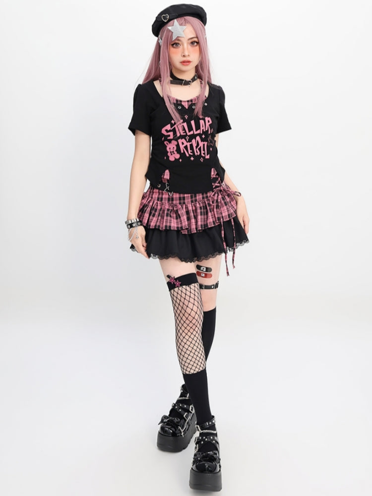 Rock girl style plaid patchwork dress / crop top / shorts