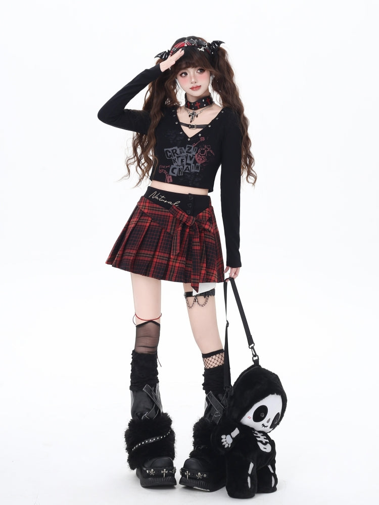 Red and Black Plaid Punk Style Metal Buckle Short Skirt