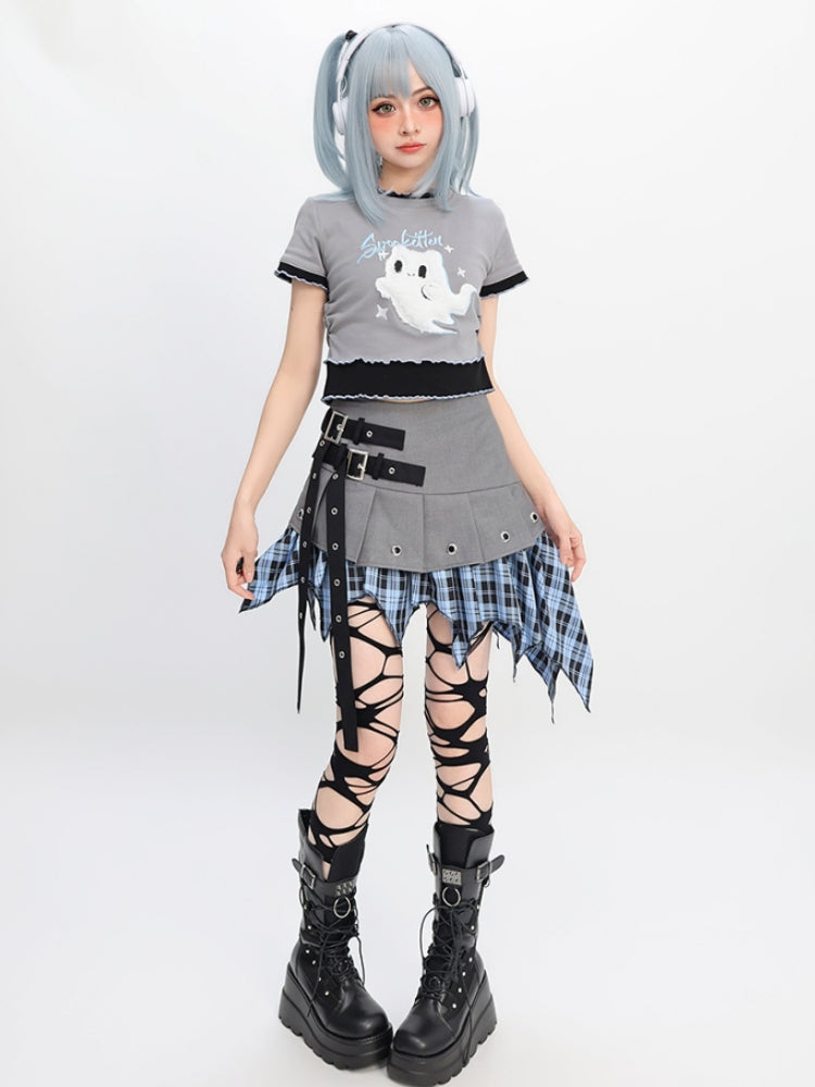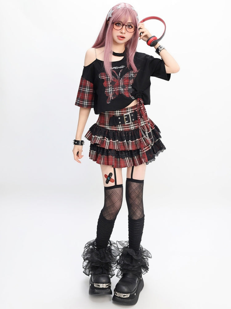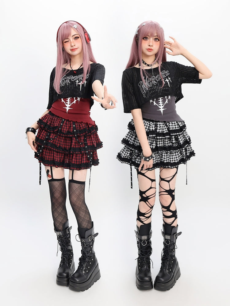 Streetwise Harajuku Plaid Crop Top / Lace-Up Mesh Shirt / Patchwork Mini Skirt