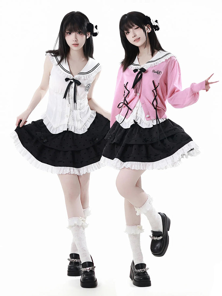 Sweet Lolita White Shirt / Pink Sweater / Black Skirt