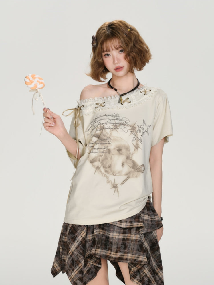 Cartoon Puppy Print Lace-Trimmed Ruffled Loose Short-Sleeve White T-Shirt